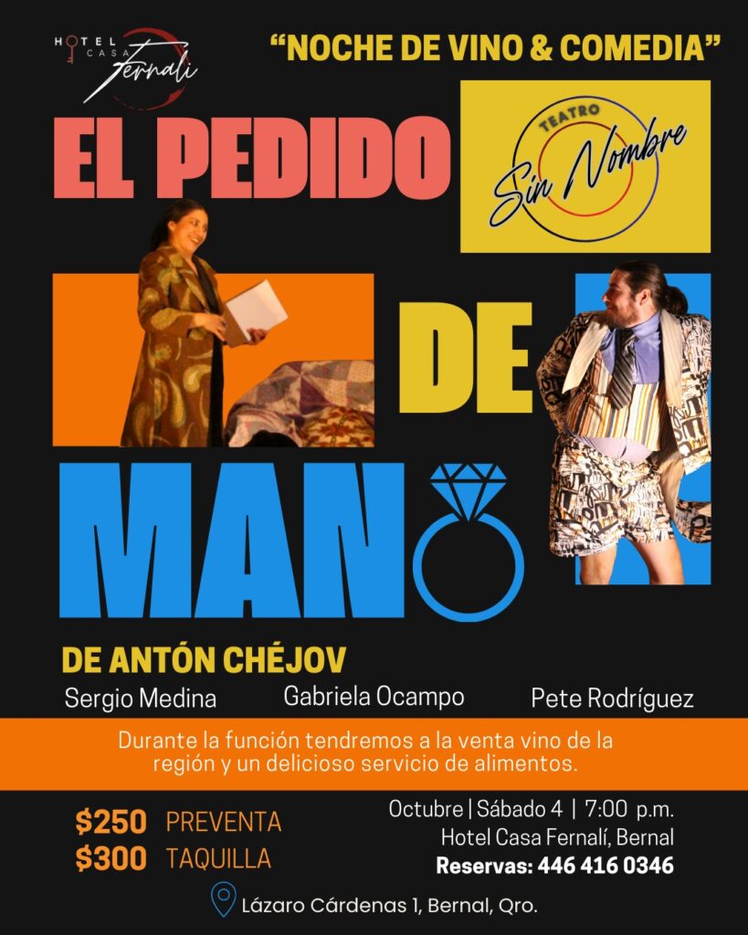 🎭✨ Vive una tarde diferente en Bernal ✨🎭 Este 4 de octubre disfruta de “El Pedido de Mano de Antón Chéjov ”, una divertida comedia de la compañía «Teatro Sin Nombre» que te hará reír de principio a fin.